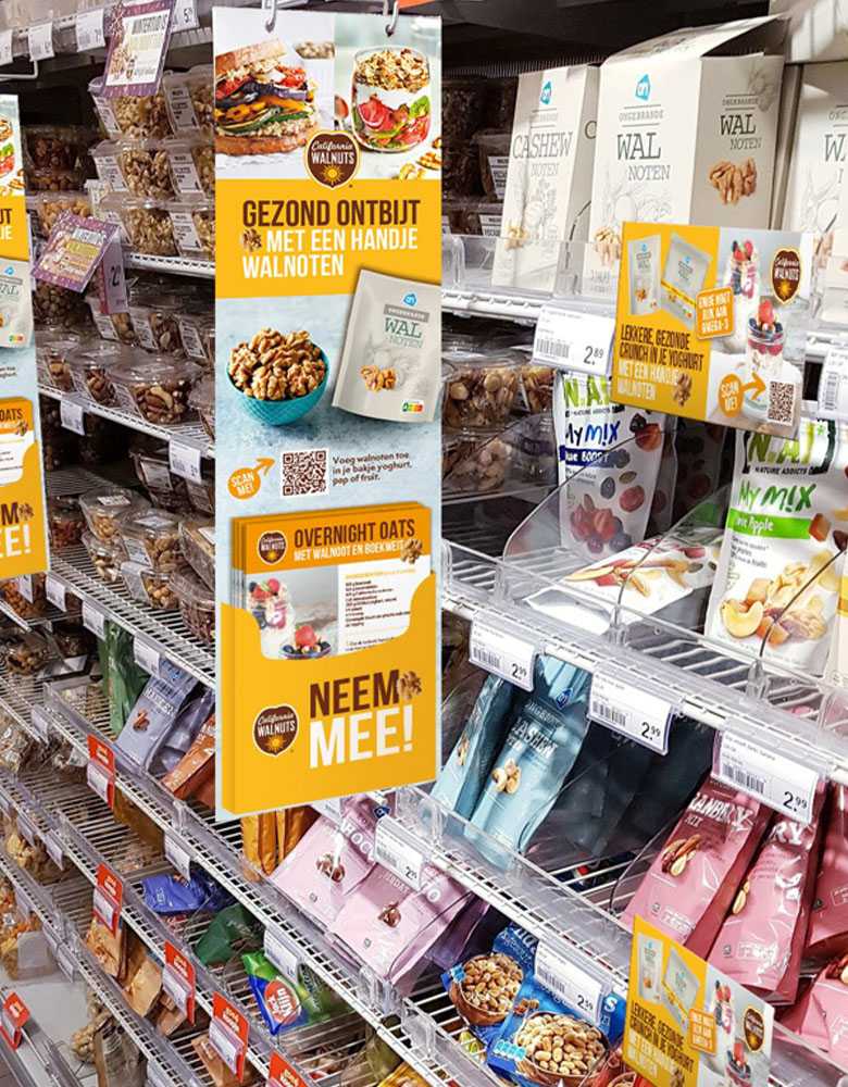 The POS campaign "Healthy breakfast with California walnuts" in the Albert Heijn supermarkets in the Netherlands achieved powerful results. Targeted activation with interactive shelf stoppers, information about the health value and quality of California walnuts together with recipe inspiration led to a significant increase in sales and made them a popular product among customers. In addition, a smart cross-category placement of wobblers in the dairy section drew many consumers to the nut shelf and thus encouraged also new shoppers to purchase walnuts. This resulted in impressive 14% share of new California walnuts buyers, illustrating the effectiveness of this campaign.