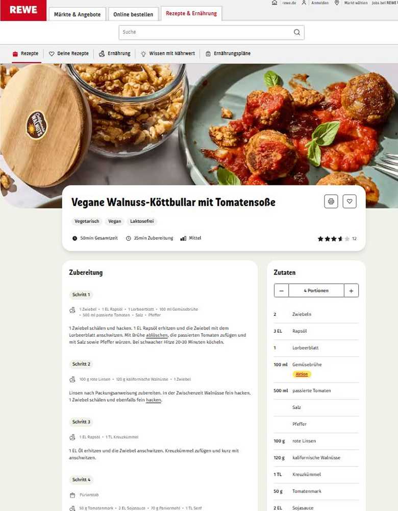 Under the title “Cooking with walnuts: natural, versatile, delicious”, visitors to the website will find vegetarian and vegan recipes that are perfect for quick, everyday cooking. Plant-based recipes are also a trend among REWE customers. The REWE team has produced the photos in their own in-house style. For example, the tip to use walnuts as a meat substitute in winter recipes such as cabbage rolls, Königsberger Klopsen or Köttbullar in tomato sauce was very well received.
